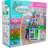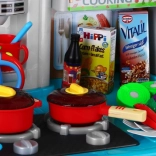 kitchen, stickers, touch panel, pump faucet, dish rack, side shelves, clock (~6 × 6 cm), 5 hooks, kettle with lid (~9 × 11 cm), 6× Velcro vegetables (mushroom, pepper, eggplant, lemon, cabbage, tomato), fruit (kiwi, cherry, strawberry), pot with lid (~6 × 13 cm), pan with lid (~5 × 17 cm), 4 plates (2× Ø ~14 cm, 2× Ø ~10 cm), 2 cups (~5 × 7 cm), 4 spatulas (~16 × 3 cm), ladle, strainer, spoon (~14 × 2.5 cm), cutlery (2 small teaspoons, 2 small knives, large knife, 2 forks ~10 × 1.5 cm), play food (sausages, egg), 3 cardboard boxes, 2 muffins with toppings, 4 cookies, pretend packs of coffee, mayonnaise and milk, black bottle