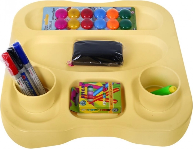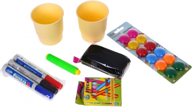 The package includes plastic cups, a set of markers, chalks, magnets, and a chalk holder to support all kinds of artistic activities.