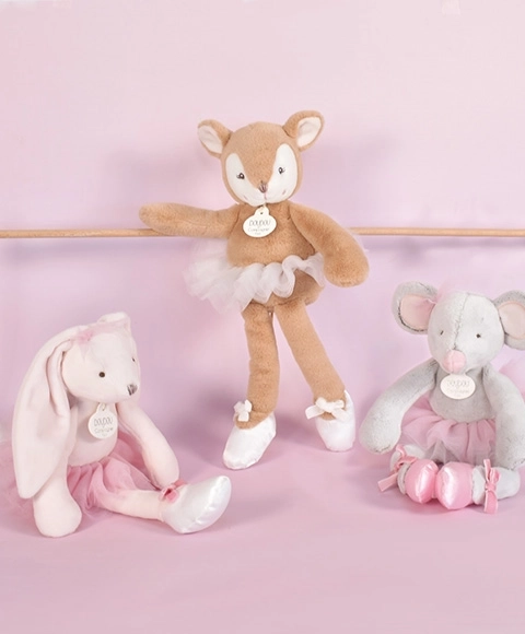 This very soft plush mouse toy is dressed in a ballerina costume with a tulle tutu skirt and satin ballet shoes adorned with a velvet bow. It offers children a blend of delicate and trendy color harmonies that appeal to both small and larger children. It is ideal not only for home play but also for walks.