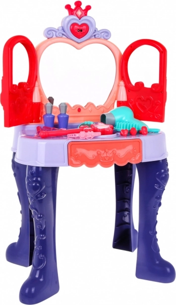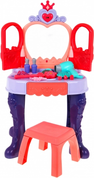 - Vanity, stool, hairdryer, magic wand, mirror, comb, 2× bottle (pretend), 2× lipstick (pretend), 2× bracelet, 2× hair tie, 4× ring, 2× hair clip, set of earrings