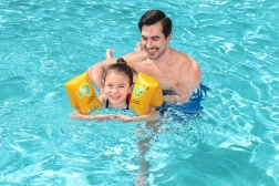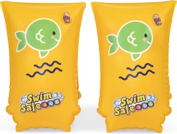 Bright yellow armbands with a green fish are easy to spot and motivate kids to play and learn in the water.