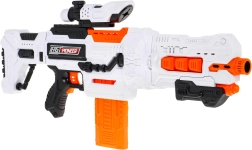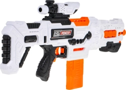 A fun electric blaster for kids aged 8+ offering semi-automatic firing, a precision sight, and two magazines for soft foam darts. Thanks to its easy controls, adjustable stock, and removable barrel, children can customize the length of the toy. The set includes 48 safe foam darts, protective goggles, and can-shaped targets for even more fun.