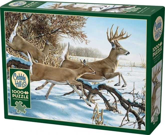 Enjoy building the COBBLE HILL Escape puzzle with 1000 pieces and an irregular die cut that brings a greater challenge than standard grid-cut puzzles. The box includes a 31.6 × 22.9 cm reference poster; the finished puzzle measures approx. 67.6 × 48.9 cm.