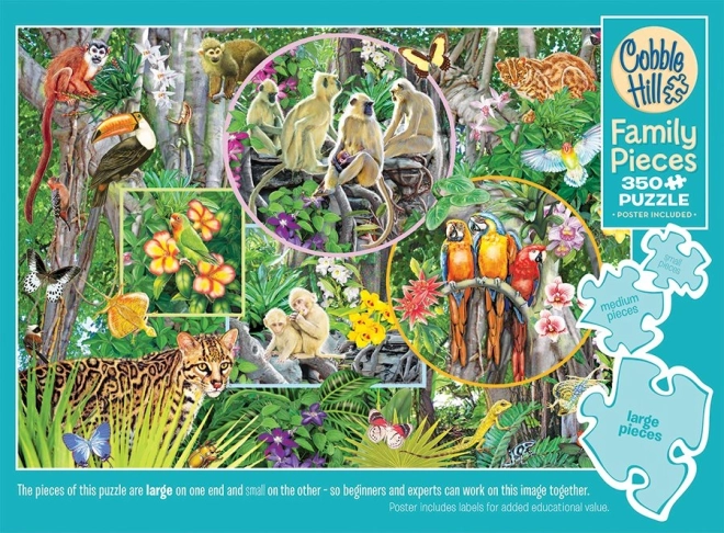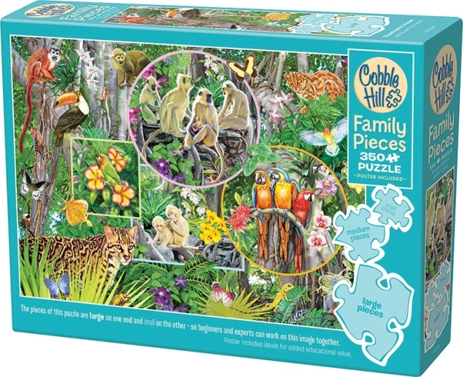 Enjoy quality time together with the COBBLE HILL family puzzle – Enchanted Rainforest with 350 pieces in three sizes. Thanks to the small, medium, and large pieces, kids, parents, and grandparents will all have fun assembling it. The unusual piece shapes and asymmetric die-cut offer a fun challenge and a better assembling experience. The finished picture measures approximately 67.6 × 48.9 cm.