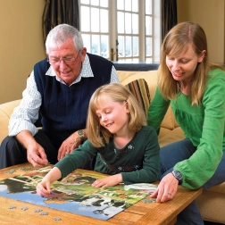 Introducing the unique Cobble Hill family puzzle. This puzzle includes three different piece sizes—small, medium, and large—allowing comfortable assembling for all family members.