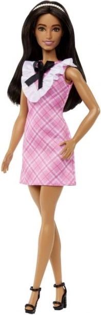 BARBIE Fashionistas dolls celebrate diversity and show how fun it is to express personality through fashion. This doll with long dark hair and a pearl headband stands out with a pink checkered dress featuring a bold ruffled collar and a black bow. With refined details and timeless style, she is perfect for everyday play and for expanding a collection.