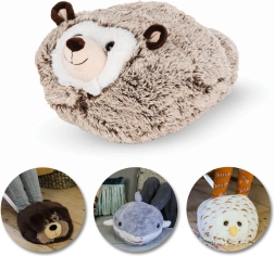 A one-piece, super soft and cozy oversized home slipper that works as a foot warmer and can also serve as a stylish accessory or toy, because kids love cute things. The ultra-soft filling and comfortable interior naturally warm your feet without risk of burns or overheating. Suitable for indoor use, ideal for relaxing on the couch or in bed. Wear it while watching TV, gaming, working on a computer, reading a book, or other seated or lying-down leisure activities. This product line offers various animal themes, so every family member can have their own animal friend by their feet. In the Cozy Noxxiez range you will also find, in many cases, a 3-in-1 warming plush pillow or a hooded blanket with pockets in the same animal theme, so you can have a complete warming set in a matching design. In 2023, an all-new addition arrived: TV hoodie blankets for children aged 3–6 and 7–12, which also thematically match some collections.