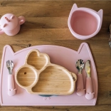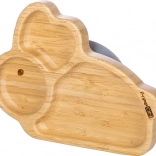 Adorable bunny-shaped children's plate made of quality bamboo with a removable suction base for a secure hold on the table. It has 3 compartments for organized serving, safe materials free from BPA, PVC, phthalates, and melamine, and easy maintenance.
