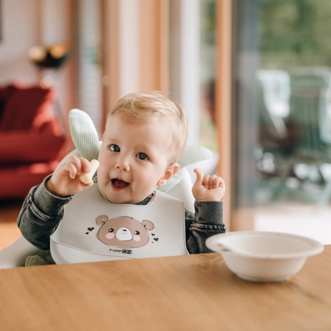 Caught in a battle with stains at every feeding? This silicone bib with a bear motif will help! It is soft, lightweight, and comfortable, so your child can tolerate it even during longer sittings at the table. Thanks to its adjustable neck fastening, the bib will grow with your child. A large collection pocket ensures that leftover food ends up where it should, and not on your child's clothes.