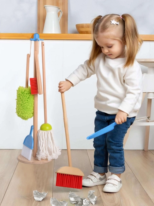 This set includes colorful play tools such as a broom, mop, and duster, enhancing both the visual and play experience for children.