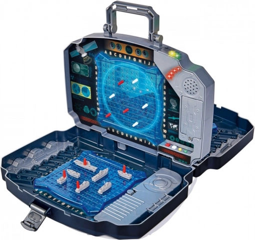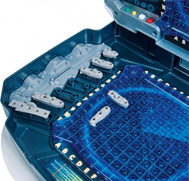 After setting up the dividing wall, each player places their ships (hidden from the opponent) on any squares of their own game board. Ships must not touch each other directly. The player whose turn it is calls out coordinates to the opponent, e.g., C3. The opponent checks whether any of their ships has been hit and presses the red button to indicate a hit or the white button to indicate water; an explosion or a water sound will play accordingly. The lights turn on one after another. When the projectile lands in the water, the lights go out. In case of a hit, the lights flash alternately. The shooting player marks the corresponding square, e.g., C3, on their board mounted on the weapon wall with a red peg for a hit or a white peg for water. The opponent marks the received hit on their ship with a red peg. As long as the player keeps hitting, they may continue shooting.