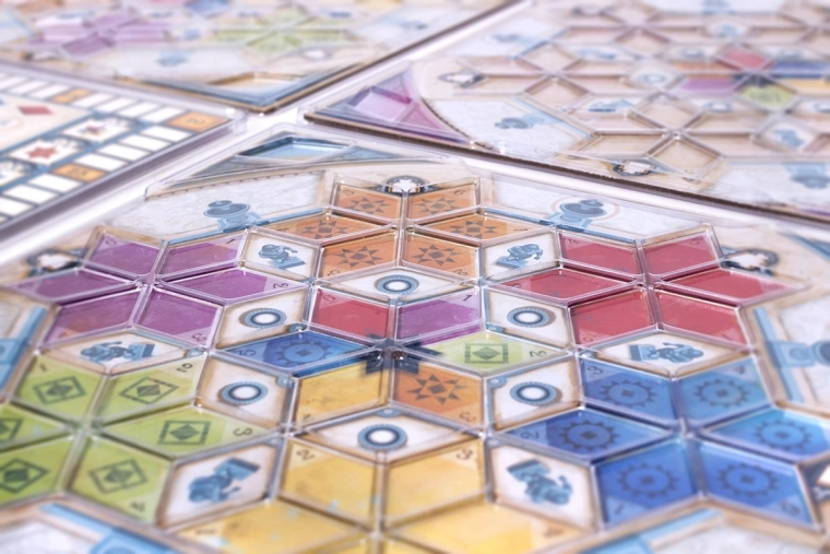 Breathe new life into AZUL: SUMMER PAVILION. The Glowing Pavilion expansion offers double-sided boards with predefined colors for the central star, letting you plan unique strategies and score in new ways. Gameplay is further spiced up by an adjusted color order each round and a new scoring system that rewards clever tile placement.