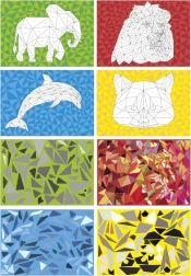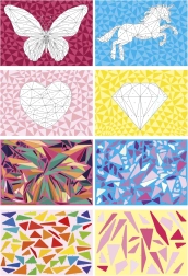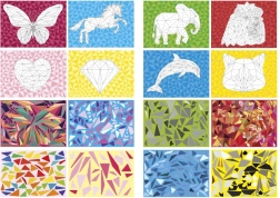 The set includes various designs composed of geometric shapes and colors, allowing you to create impressive artworks.
