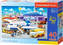 Colorful maxi puzzle for children featuring DAY AT THE AIRPORT: 40 large pieces for easy assembly, finished size 59 × 40 cm. Quality Castorland craftsmanship develops fine motor skills, focus, and imagination. Suitable for ages 4+.