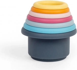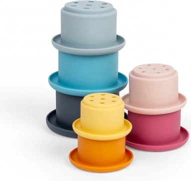 A colorful set of seven stacking cups made from 100% food-grade silicone, completely plastic-free. Ideal for the bath, sand play, and at home. Patterned holes in the bases create a waterfall effect, helping kids practice fine motor skills, hand–eye coordination, and color recognition. The material is durable, non-toxic, easy to clean, and dishwasher safe.