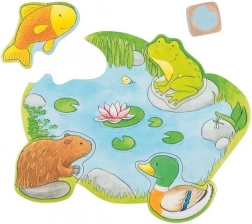 Children learn to recognize different animals and their natural environments, such as trees and ponds.