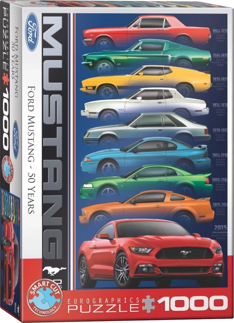 Celebrate an automotive legend with the EUROGRAPHICS puzzle marking 50 years of the Ford Mustang. Enjoy 1000 pieces, a unique irregular die-cut for a greater challenge, and a finished size of 48.89 × 67.63 cm. The text on the image is in English.