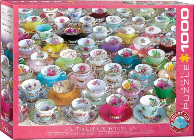 Enjoy hours of fun with the high-quality EUROGRAPHICS puzzle featuring a tea cup collection motif with 1000 pieces. Thanks to a special die-cut with unusual piece shapes, assembling offers higher difficulty, original shapes, and an exceptional visual experience. Once completed, the puzzle forms an image measuring approximately 68 × 48 cm, ideal for framing.
