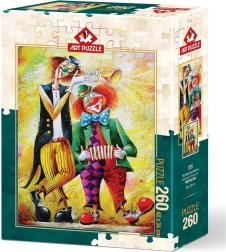 A cheerful clown-themed puzzle from ART PUZZLE offers 260 pieces and measures approx. 34 × 48 cm when assembled. The manufacturer also provides a missing-piece replacement service – if the design is still available and you provide the production batch number.