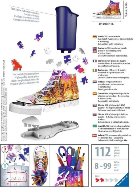 This 3D puzzle offers an innovative and fresh shape for anyone who enjoys connecting pieces and fashion accessories. Thanks to the specially curved and flexible pieces that fit perfectly in place, you can build a realistic-looking sneaker with the New York City motif - the city that never sleeps.