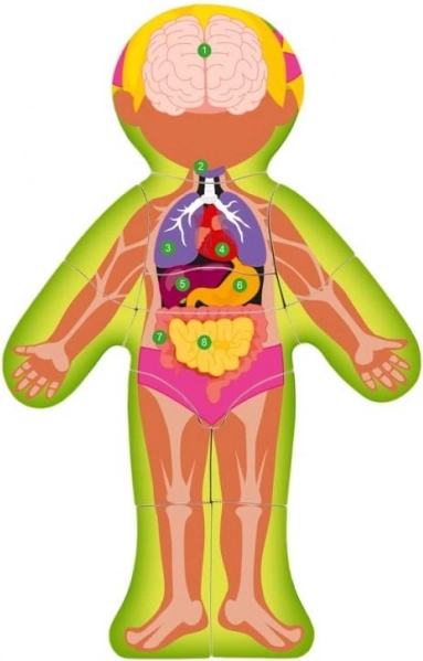 This double-sided puzzle offers a unique view of the human body through a girl's figure with twelve pieces. One side illustrates the human organs, while the other shows the structure of the human skeleton. Assembling this puzzle helps the child better understand how the human body works: