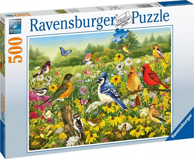 Ravensburger puzzle Bird Meadow, 500 pieces. Precise cut, vibrant colors, assembled size approx. 49 × 36 cm. Great fun for children and adults.