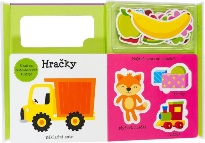 This set is a perfect choice for young children learning new words and improving their fine motor skills. The cheerfully illustrated book introduces children to the world of basic words, colors, fruits, and animals. Additionally: