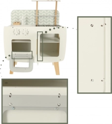 The kitchen is equipped with basic appliances like an oven, stove, and sink. Movable parts like turning knobs add realism to the play, encouraging greater involvement and interest in culinary activities.