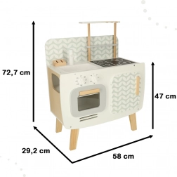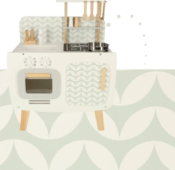 The kitchen's design is simple and gently pastel, making it fit into any child's room as a central element of play and as an aesthetic accessory.