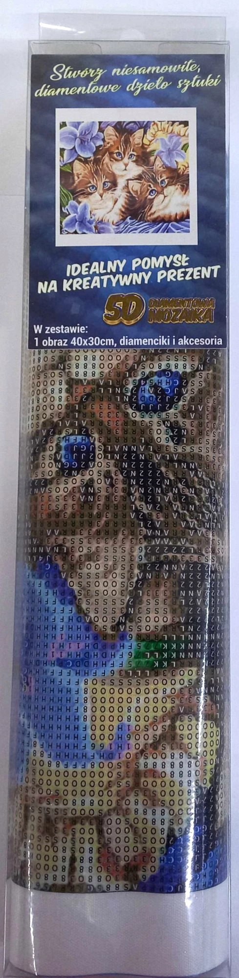 Diamond painting – instructions: The top side of the canvas is coated with adhesive and covered with a transparent film. Remove the film gradually in sections as you apply the beads. Removing the entire film at once may dirty the adhesive layer and the beads may not stick as well. The canvas contains symbols listed in the included legend that correspond to the numbered bag of beads. Pour the beads from the selected bag into the tray. Load wax into the tip of the pen so the beads easily stick to it. Apply the beads to the picture with the pen. After finishing a given color, pour the beads back into the bag and continue with the next color.