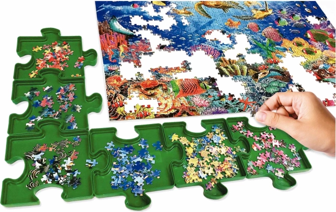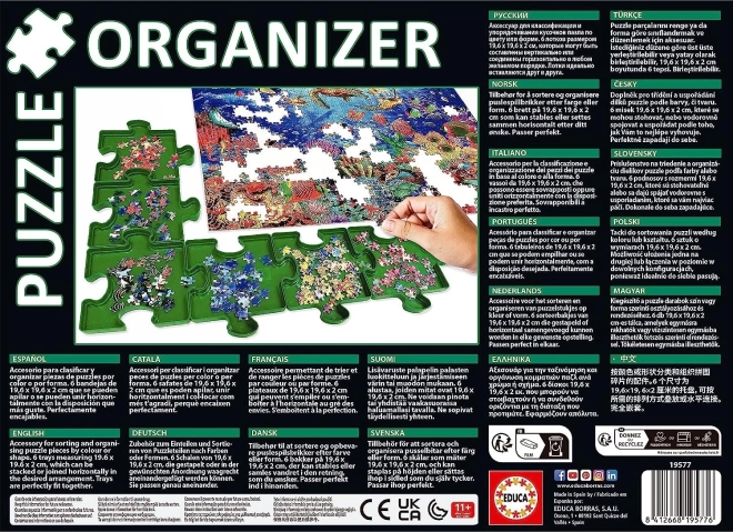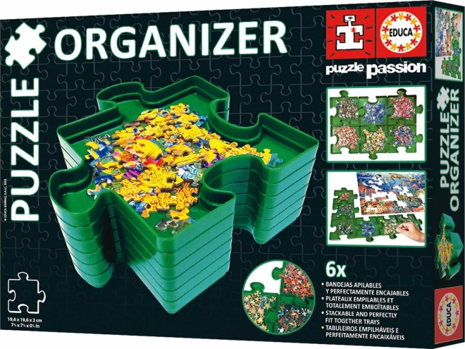 The practical EDUCA puzzle organizer makes sorting and assembling pieces easier. It includes six stackable plastic trays shaped like puzzle pieces, which can be connected into various layouts and easily stacked to save space.