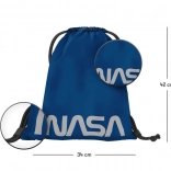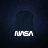 The blue drawstring backpack features a bold NASA logo that glows in the dark, enhancing visibility.