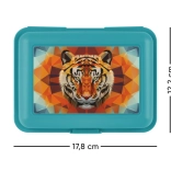 Turquoise plastic box with a colorful tiger graphic on the lid adds style to any lunch.