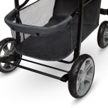 Safety is a priority: the five-point harness with soft pads, a bumper bar with a tray and cup holder, and testing to EN 1888 (SGS lab) provide confidence for everyday use. Agile EVA wheels with soft suspension on the front axle smooth out uneven surfaces, easily navigate city streets, and their lock for straight-ahead travel keeps a stable direction on paving.
