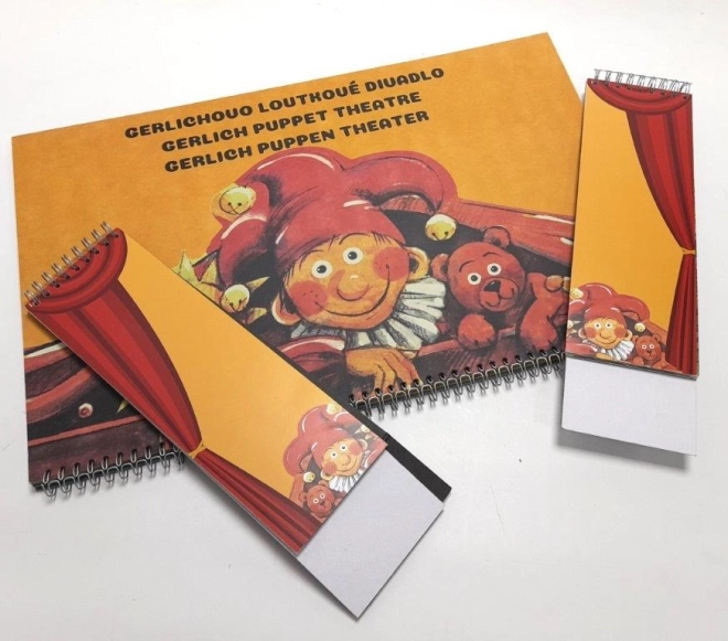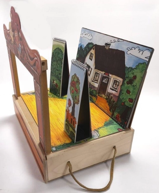 - Theatre with curtain and proscenium, 14 puppets, 11 ring-bound scenes with floor, side flats