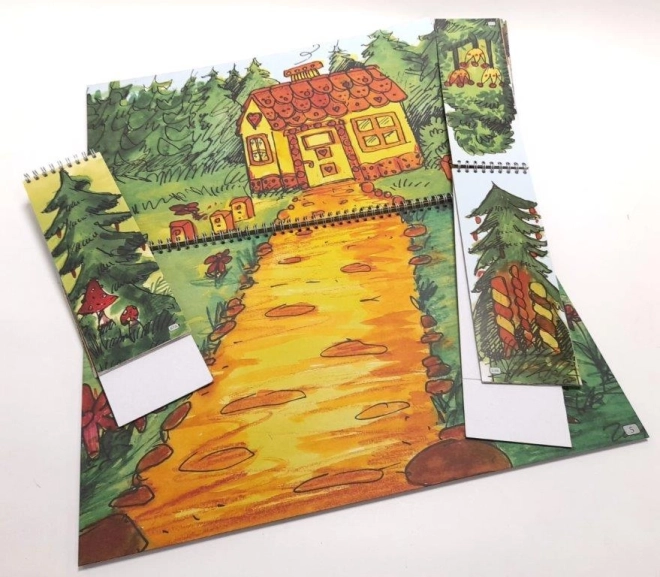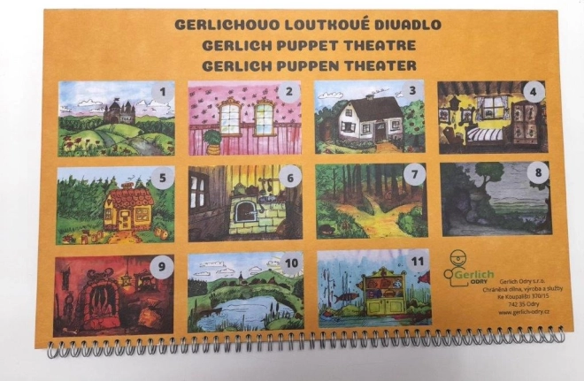 The set includes 11 double-sided or paired scenes on a ring binding with floor: in the castle / in front of the castle, in front of the cottage / in the cottage, gingerbread cottage / inside the gingerbread cottage, in the forest / by the cave, in hell / by the pond, in the pond. The puppets include the royal family, heroes, and fairy-tale creatures—ideal for classic Czech fairy tales.
