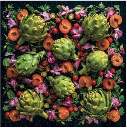 Discover the charm of perfectly imperfect produce with the GALISON Artichoke Blooms 500-piece puzzle. A motif by photographer Sarah Phillips presents a striking composition of artichokes, tomatoes, and blossoms against a black background. Thanks to high-quality printing, a matte finish, and precisely cut pieces, you’ll enjoy smooth assembly and true-to-life detail and color rendition. The puzzle is made from recycled and sustainable materials and packed in a sturdy gift box with an included reference image.