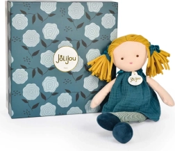 The Jade doll by Doudou Jolijou is a gentle companion for babies and preschoolers. Her boho look is highlighted by striped tights, a turquoise dress, and “spaghetti” blonde hair tied into pigtails. Thanks to her soft textile design, she is wonderfully cuddly and maximally safe.