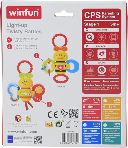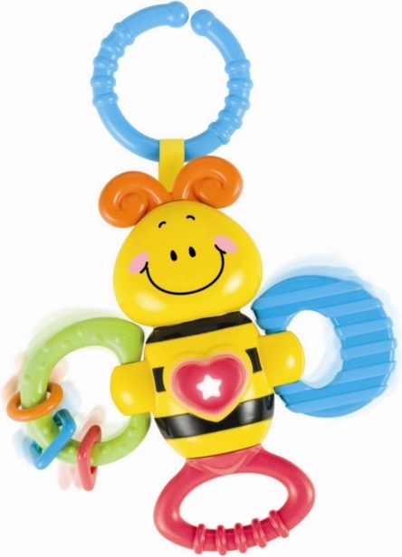 A cheerful bee-shaped rattle for babies from 3 months brings lights, melodies, and pleasant sounds. Thanks to the soft teethers and comfortable grip, it supports fine motor skills, sensory development, and hand–eye coordination. The safe design made from quality materials delights both children and parents.