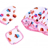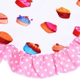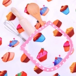 The apron and accessories feature a colorful cupcake pattern with pink ruffles to protect clothing and add a fun style to cooking.