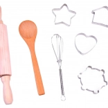 The wooden rolling pin and spoon, metal whisk, and set of metal cookie cutters (heart, star, etc.) are adapted to child-sized hands and support fine motor skills.