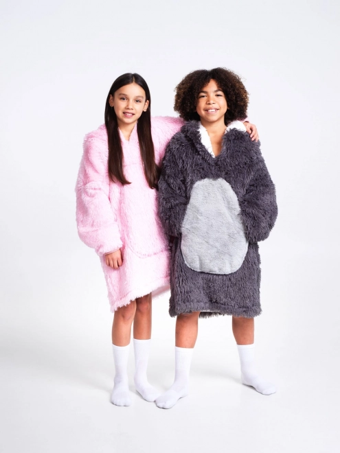 A cute and practical Cozy Noxxiez TV hoodie blanket for kids aged 7–12 years that combines the comfort of a hoodie with the warmth of a blanket. The outer side is made of super-soft flannel and the inside of plush sherpa fleece to keep kids warm at home and outdoors. It features a large unicorn-themed hood and an oversized front pocket to warm hands – ideal for the couch, playtime, and for indoor and outdoor use.