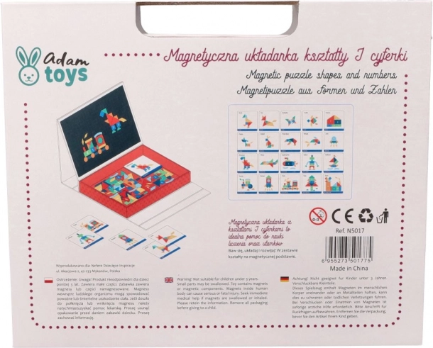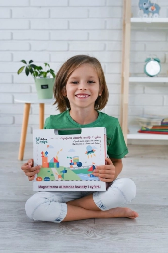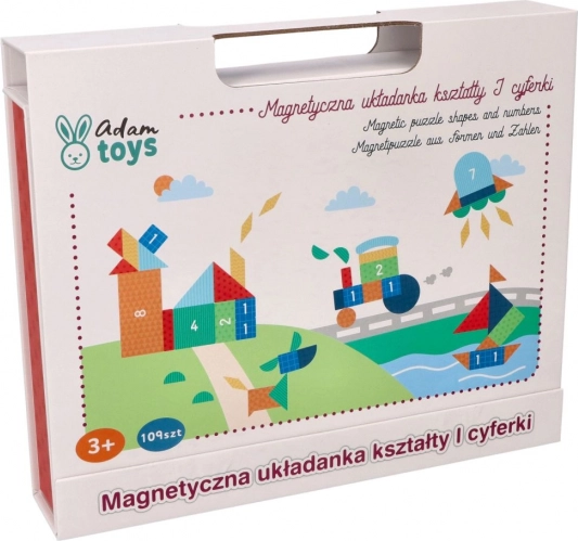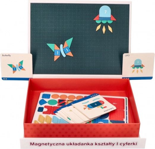 Discover a smart educational toy that develops fine motor skills, logical thinking, and imagination. Children build pictures from magnetic puzzle pieces—squares, triangles, circles, rhombuses, and more; many pieces are marked with digits 1–9 for first steps in math. The compact suitcase-style design with a handle is ideal for fun at home and during travel.