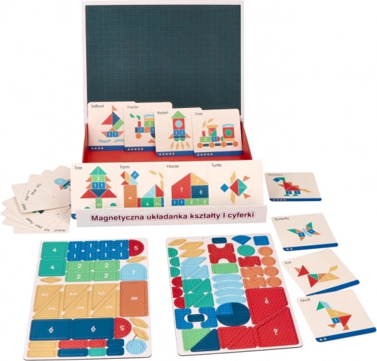 A practical magnetic puzzle in the form of a folding board hides up to 109 magnetic pieces that let children playfully practice shapes and numbers. The set includes a lined board, 20 colorful pattern cards, and plenty of pieces in various sizes and shapes for endless arranging options at home or on the go.