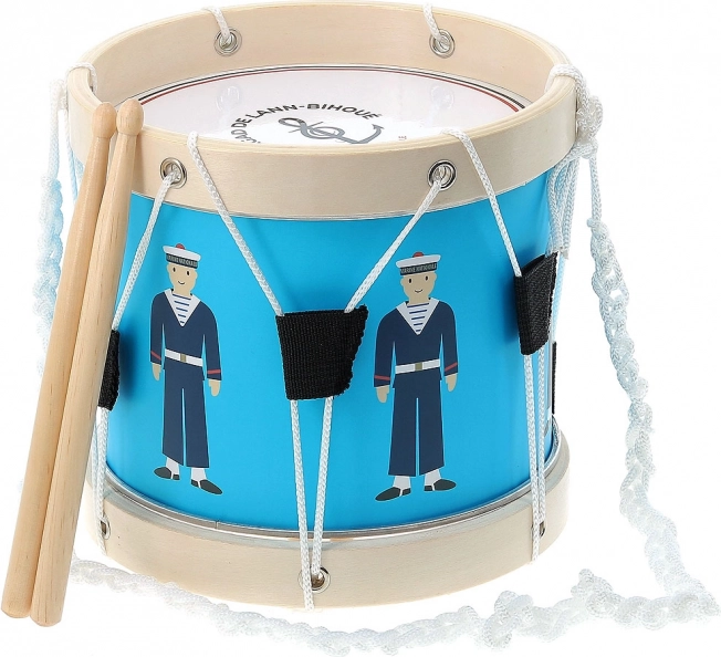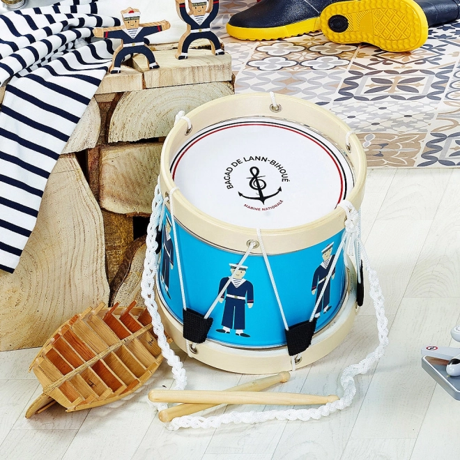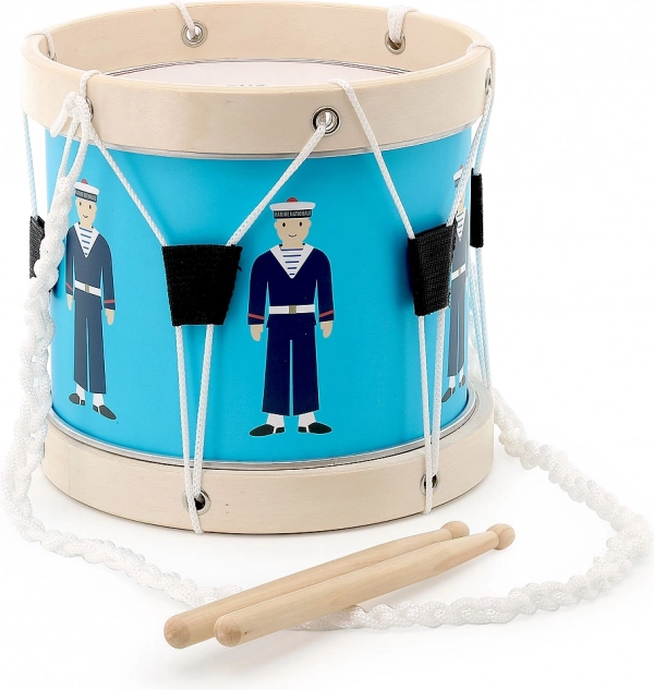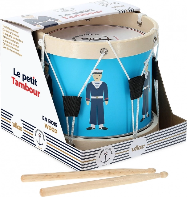 Give kids their first musical steps with the VILAC drum in a nautical design. Blue shells with sailor illustrations, wooden rims, and a practical strap invite them to explore rhythms. The instrument is great for developing a sense of tempo, focus, and cooperation.
