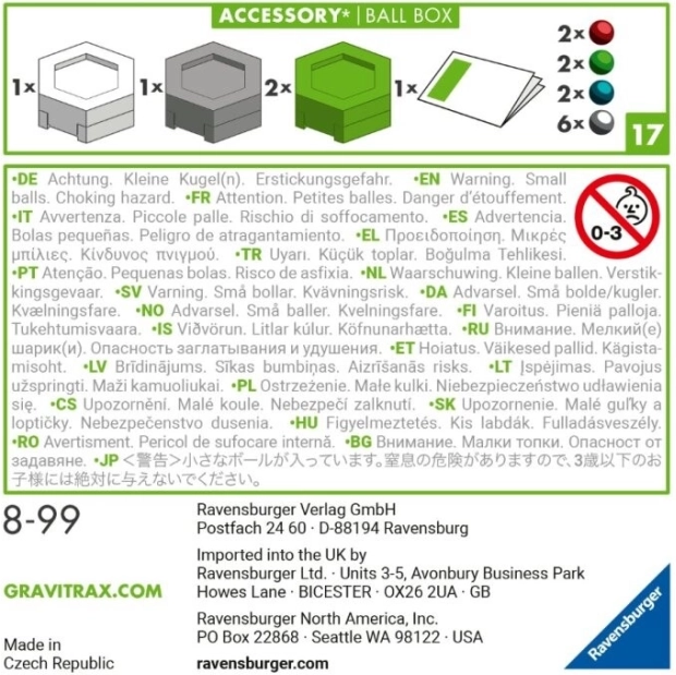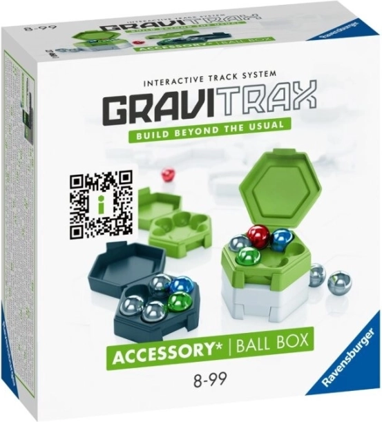 This GraviTrax set contains 12 colorful balls: 6 silver, 2 red, 2 blue, and 2 green. The balls can be organized by color or mixed according to your imagination. The set also includes 4 boxes for organizing the balls - 2 green, 1 white, and 1 gray. These boxes can be stacked, allowing for storage even in smaller spaces.