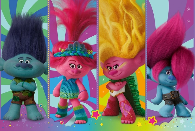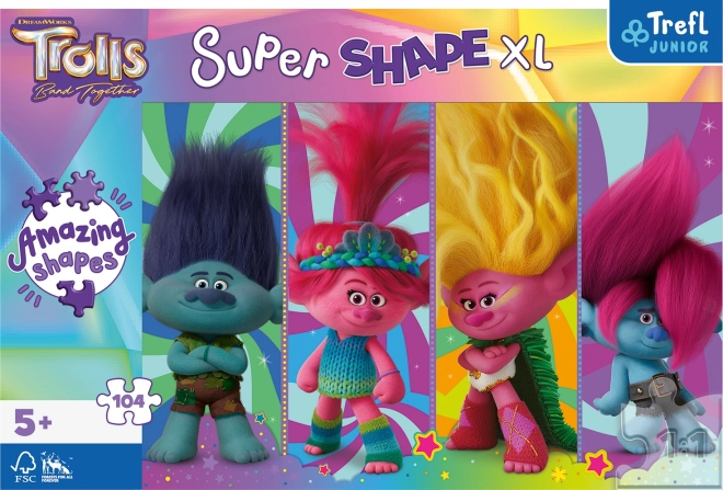 Cheerful children’s puzzle with a Trolls theme offers 104 pieces in a larger Super Shape XL format for comfortable assembling. Once completed, it forms a colorful picture measuring approx. 60 × 40 cm, ideal for developing patience, fine motor skills, and imagination.