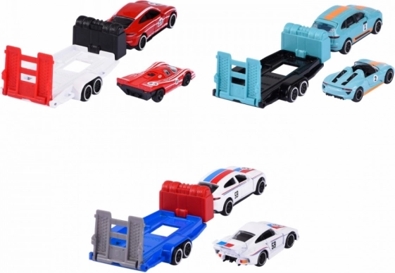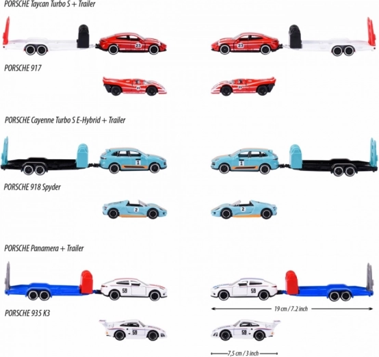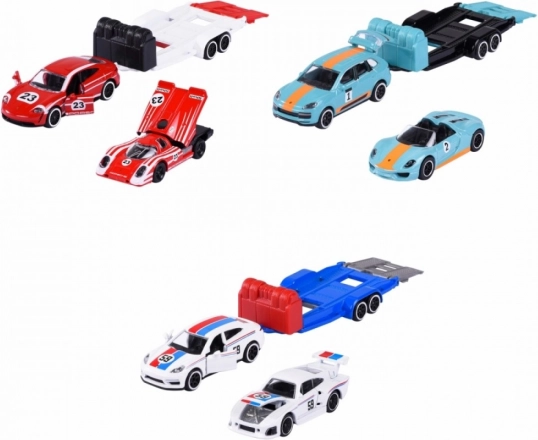 Each set includes 2 licensed PORSCHE cars and a trailer in matching colors. Thanks to the 1:64 scale, they fit easily in a pocket and impress with detailed workmanship, including opening parts. Great for kids aged 3+ and enthusiastic collectors.