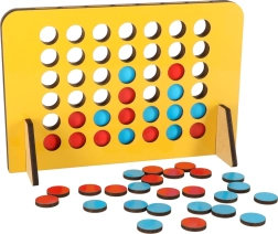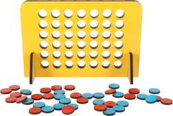 Play the popular game Four in a Row, now in a travel version, and enjoy fun anytime, anywhere. The game's goal is to connect four tokens of the same color in a horizontal, vertical, or diagonal line. The wooden board with holes allows easy token insertion.