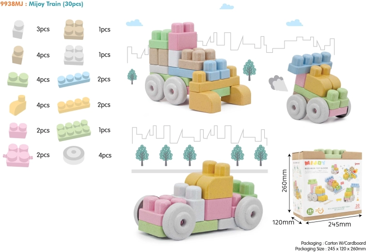 A set of construction blocks for the youngest from an eco-friendly series designed to promote the use of less plastic. The blocks are made of 25% biocomposite from rice husk waste. They have rounded edges, various shapes, and pastel colors. The set, consisting of 30 pieces, enables various constructions, positively influencing the child's development, enhancing spatial and motor skills, and fostering creativity.